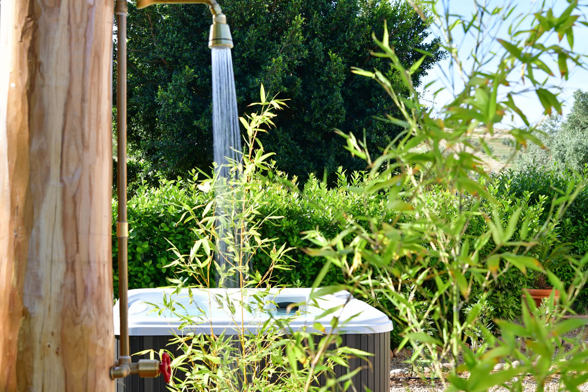 Camera con letto matrimoniale e due letti singoli arredata con mobili d’epoca del primo 900 siciliano, dotata di vasca idromassaggio jacuzzi , giardino esterno, bagno privato ampio con doccia, lavabo, bidet, wc, set di cortesia, biancheria da bagno, phon, climatizzazione fredda e calda.