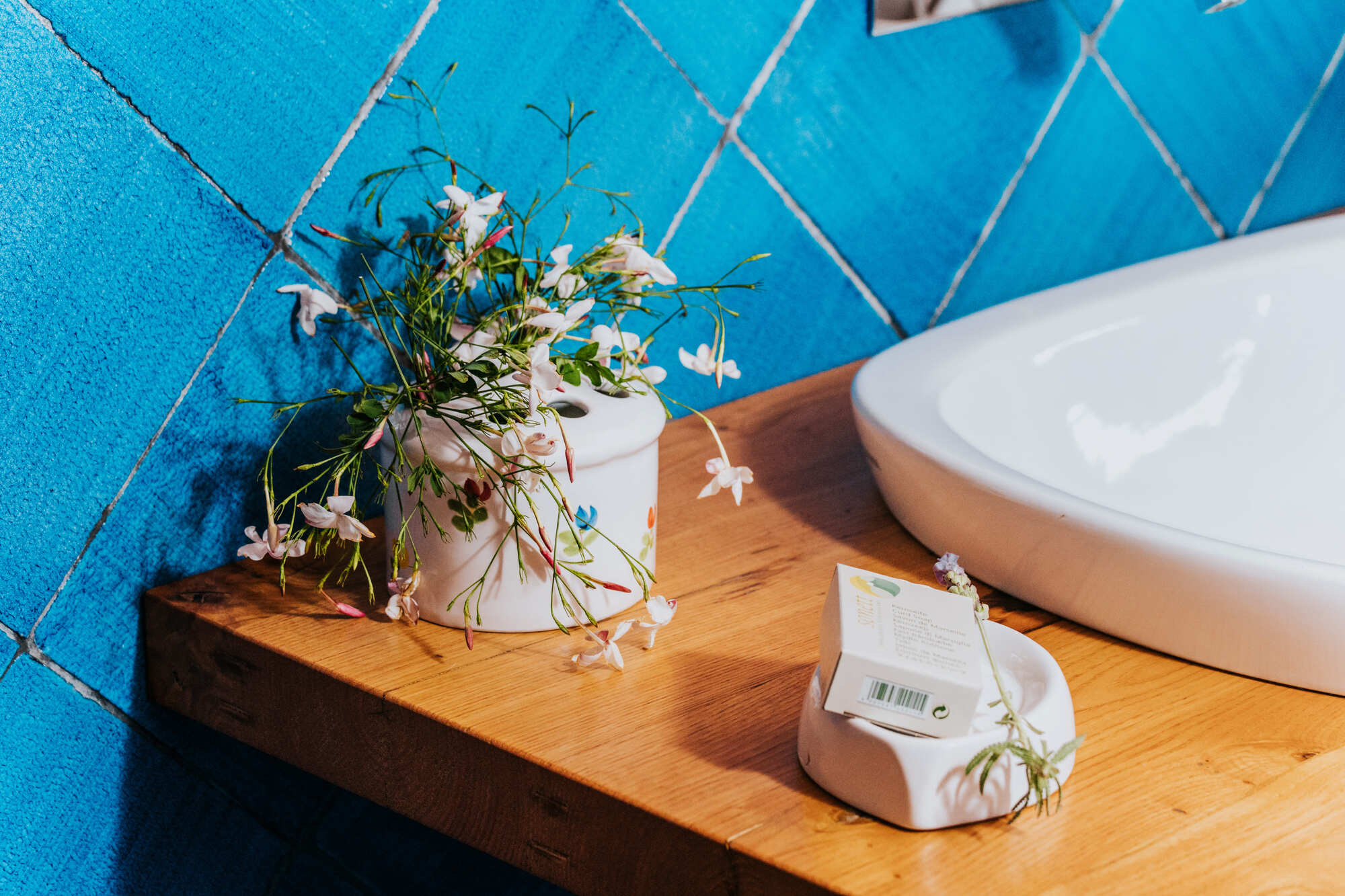Room with double bed and a single bed furnished with antique Sicilian furniture from the early 900s, equipped with a large private bathroom with shower, sink, bidet, toilet, courtesy set, bath linen, hairdryer, cold and hot air conditioning.